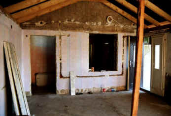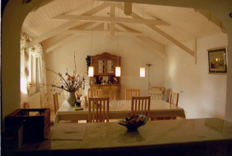 Das Dach wurde erneuert. Der Raum zum Giebel hin geöffnet, die Fenster mit Doppelglas versehen, die Öffnungen zur Küche neu gestaltet, so dass ein Raum voller Licht und Weite entstand, der aber auch gemütliche Ecken für den persönlichen Rückzug bereit hält. In diesem Raum dominiert - neben dem alten Büffet-Schrank - die modernen, handgefertigten Möbel, vor allem der große Tisch, der für eine Vielzahl von Gästen Platz bietet.